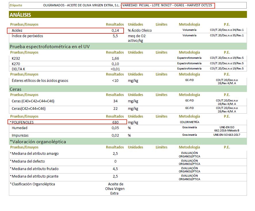De olijfolie van dit jaar heeft een ultralage zuurtegraad (0,14%) en uitzonderlijk hoge polyfenolen (630mg/kg), wat wijst op een uitstekende versheid, gezonde olijven en een rijk gehalte aan antioxidanten.